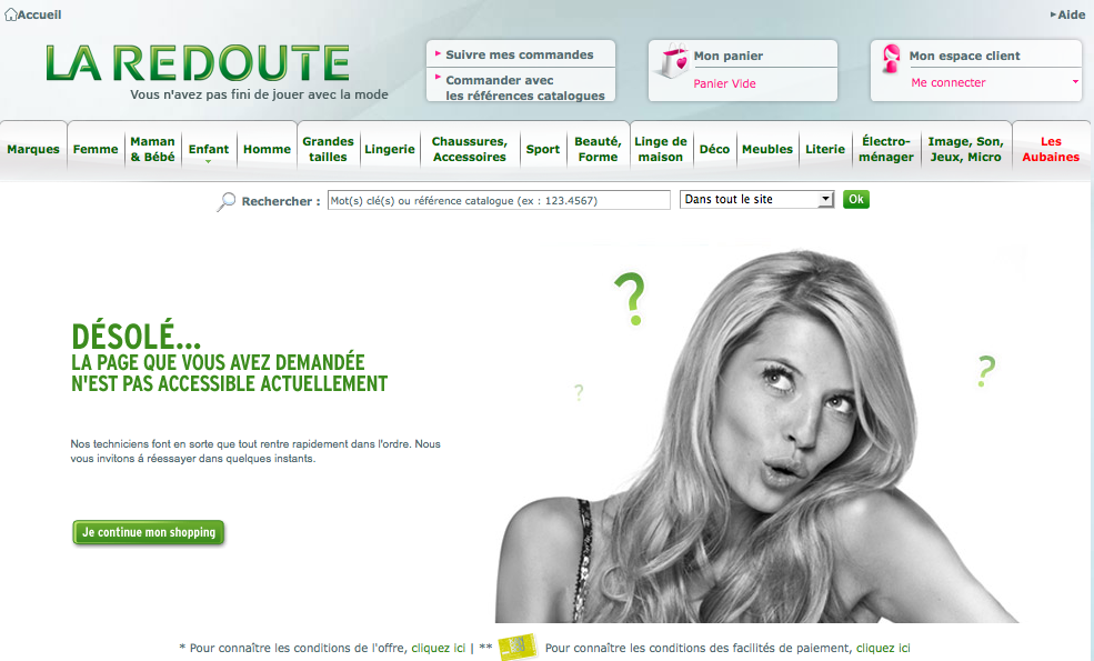 Je trouve la 404 de la Redoute plutôt réussie, d’autant que j’ai l’impression qu’elle change régulièrement en fonction des saisons. Bravo la Redoute !