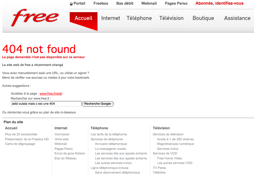 La 404 de Free, basique mais fonctionnelle, avec un moteur de recherche pour trouver rapidement ce que l’on cherche, même si ça a changé d’endroit.