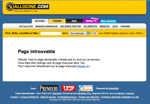 Un peu déçu par la 404 d’Allociné. Par contre c’est l’un des rares sites media que que j’ai croisé qui ne profite pas de ses erreurs pour continuer à faire de la pub…