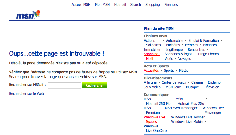 La 404 de MSN laisse échapper un petit Oups.