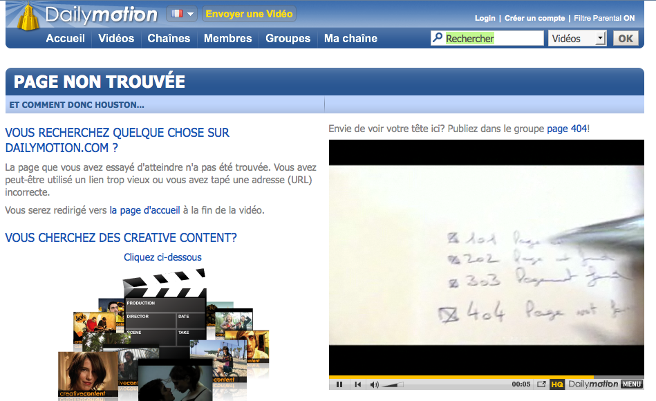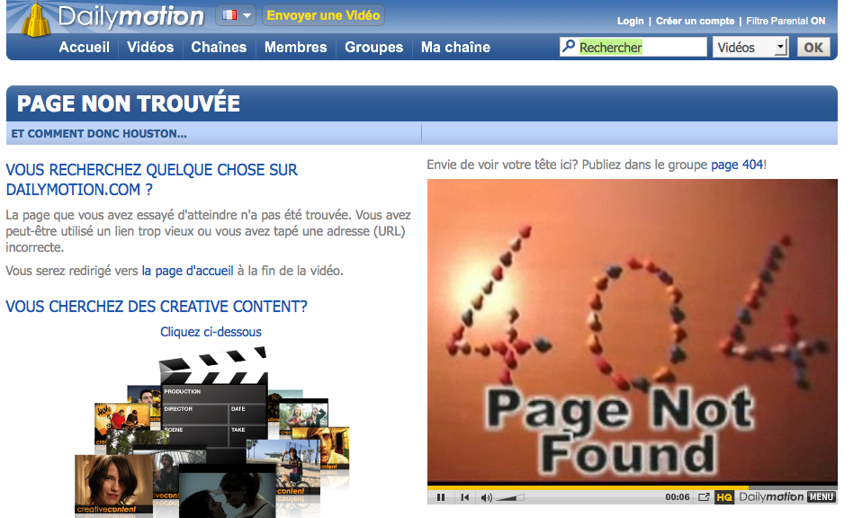 La grande surprise : les 404 de Dailymotion. Une même page mais avec plein de vidéos différentes qui donnent envie de tomber de nouveau sur des 404 histoire d’en voir d’autres.